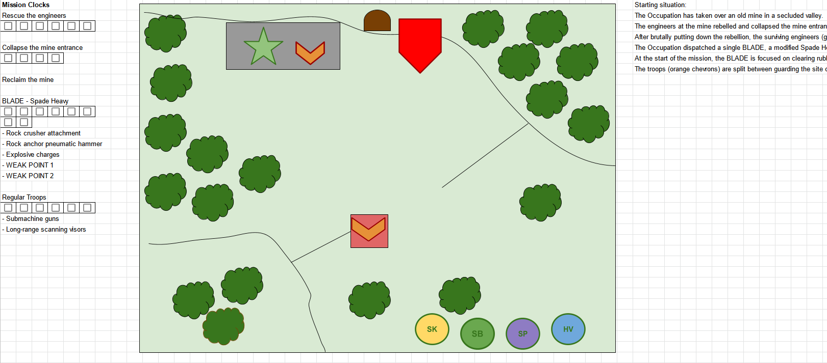 - I built a pseudo-virtual tabletop into the Google Sheets character keeper with a map of the sample Mission I've been running, along with simple tokens. It's very silly but it works.