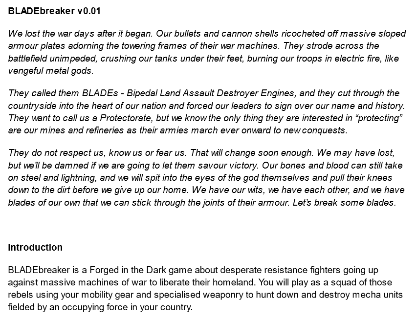 BLADEbreaker is a Forged in the Dark game about desperate resistance fighters facing terrible machines of destruction. The Occupation has taken over your Homeland, thanks to their use of massive mecha called BLADEs (Bipedal Land Assault Destroyer Engine). As members of a resistance cell specializing in taking on and taking out enemy BLADEs, you will face dangerous enemies and challenges to build up the resistance network, retake the Capital, and oust the Occupation from your home.