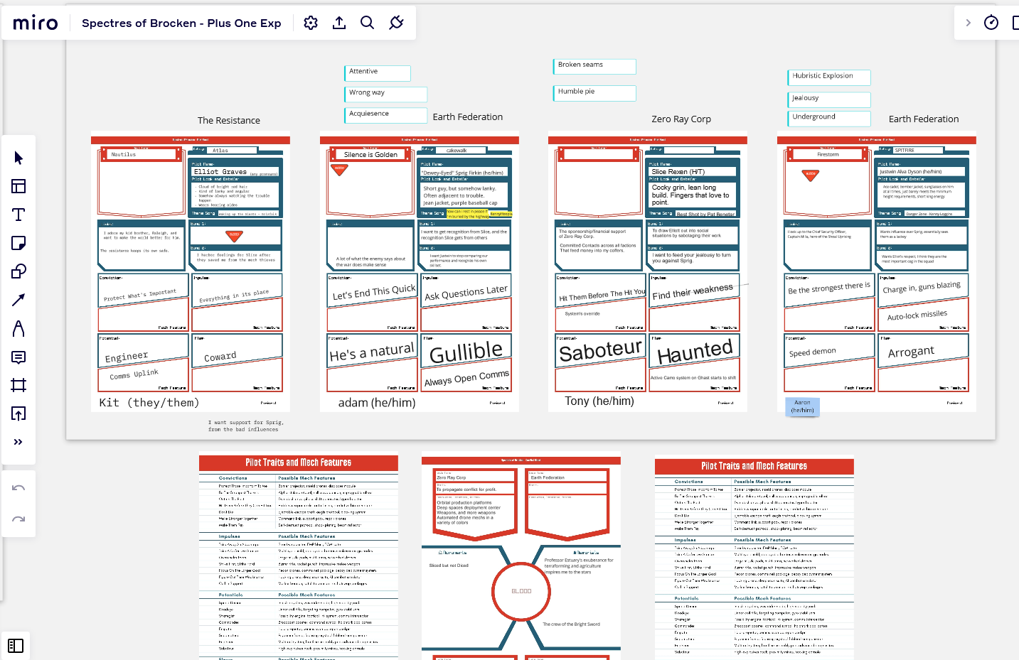 I'll still get back to updating the Google Sheets version of the play materials, and I've got some ideas on how I could build some more automation and quality of life improvements to it. For now though, I'll be using the Miro version since it's been much quicker to get up and running and looks quite nice since I can re-use assets that I made for the new preview PDF. Honestly, Miro is a pretty great tool for playing roleplaying games online, especially storygames that don't require use of dice or cards.