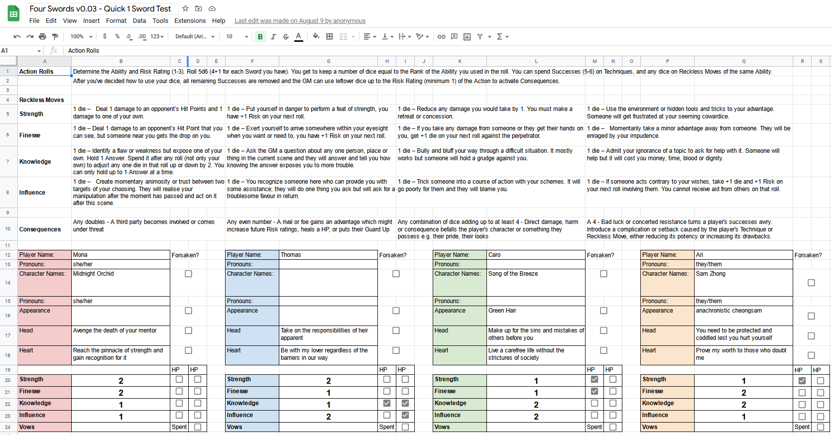 I also managed to playtest an idea I had for switching up the dice pool system in Four Swords in another Playtest Zero session. That playtest went really well, since we identified the flaws in that dice pool system pretty quickly and clearly. One of the key things was that it was quite difficult to actually meaningfully fail, but even with successes it was tricky to direct the outcomes since the Techniques and Reckless Moves are quite prescriptive and the GM always has a chance to introduce some consequences via the Risk Ratings.