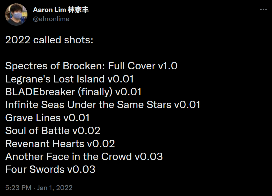 For other games, I'm aiming to put out a full Playtest Packet for BLADEbreaker in early 2023 and kick off some longer form playtests for that. I'm also hoping to release some version of Aaron Lim's Infinite Seas Under The Same Stars (I have some Ideas about the future of that game that I'm still mulling over) in 2023. I'm also pretty much done with the updated tables for Ithaca in the Cards, but I'm still hoping to work on the Lonesome Winds solo rules for the game to then release a proper "Second Expedition".