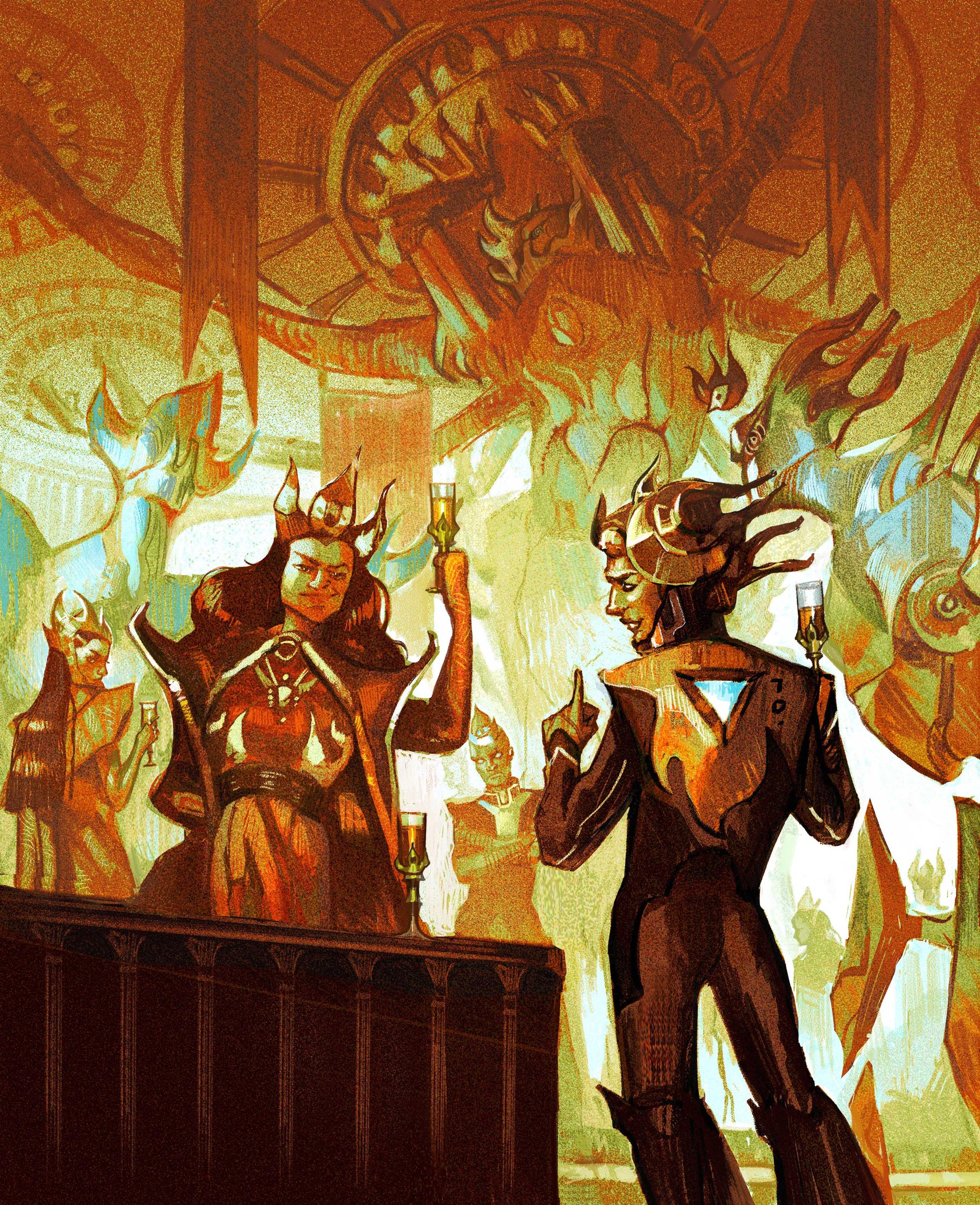 - I've also gotten to a solid template for Spectres of Brocken's World Tendencies (my term for the game seeds/pre-written settings) and I've been working with talented artists to get illustrations for each of those World Tendencies. Below are the illustrations for The Fire Quartz Crown - by Amita Sevellaraja, and Orbital Century - by Alex Connolly. I've also been quietly working with some guest writers on additional World Tendencies, and I'll have more to announce on that front later.